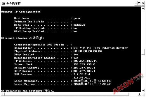 现在是万事具备,只欠嗅探。先在命令窗口中运行“Ipconfig /all”命令,查看一下肉鸡上的网址配置情况和网关IP地址(如图6)。可以查到网关(Default Gateway)为“203.207.***.1”,运行ARPSniffer命令: