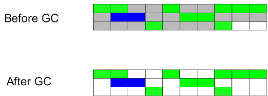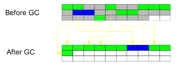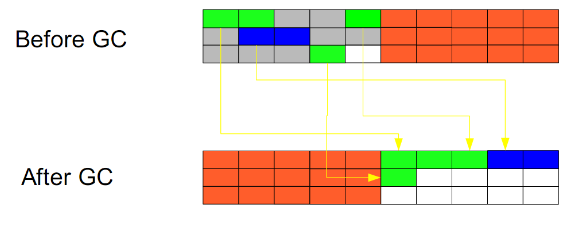此算法结合了“标记-清除”和“复制”两个算法的优点。也是分两阶段,第一阶段从根节点开始标记所有被引用对象,第二阶段遍历整个堆,把清除未标记对象并且把存活对象“压缩”到堆的其中一块,按顺序排放。此算法避免了“标记-清除”的碎片问题,同时也避免了“复制”算法的空间问题。