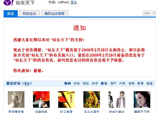 前段时间一直在用雅虎的站长天下,配合阿里妈妈的广告可以挣个钱,费了好大的功夫才做好的网站,没想到过完年就要关门了,哎,真是悲哀!害的我在上面忙活了好几天,真是的。