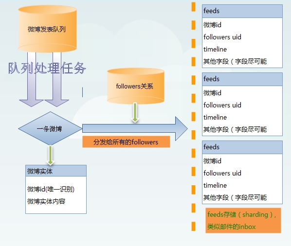推模式需要把一篇微博推送给所有关注他的人(推给所有的粉丝),比如姚晨,我们就需要推送给2594751个用户的feeds表中。当然,feeds表可以很好的进行sharding,存储也都是一些数字型的字段,存储空间可能不是很大,用户在查询自己关注的所有人的feed时,速度快,性能非常高,但是推送量会非常大,姚晨发表一篇,就会产生200多万条数据。试想,一个大量用户的微薄系统通过使用推模式,是不是会产生非常惊人的数据呢?