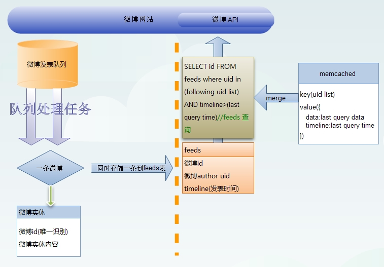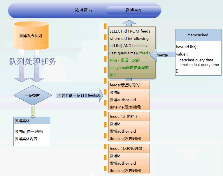 拉模式只需要用户发表微博时,存储一条微博数据到feeds表中(feeds表可以是一个临时表,只保存近期可接受范围的数据).用户每次查询feed时都会去查询feeds表。比如姚晨打开自己的微薄首页,就产生:SELECT id FROM feeds where uid in(following uid list) ORDER BY id DESC LIMIT n(查询最新的n条),缓存到memcached