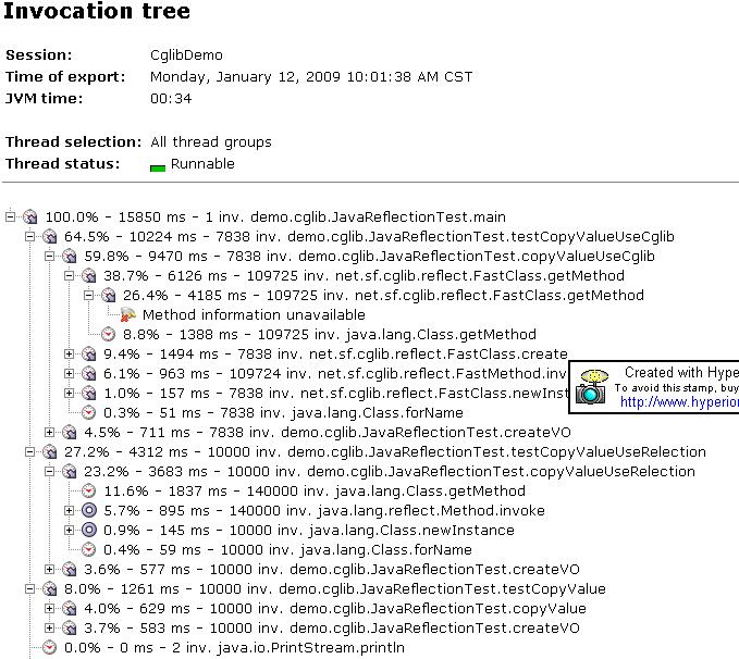 Object o = null;try {Class clazz0 = Class.forName("demo.cglib.ManagelogVO");//FastClass clazz = FastClass.create(clazz0);o = clazz.newInstance();FastMethod setterMethod = null;FastMethod getterMethod = null;Object v = null;setterMethod = clazz.getMethod("setLogid", new Class[]{Long.class});getterMethod = clazz.getMethod("getLogid", null);v = getterMethod.invoke(managelogVO, new Object[]{});setterMethod.invoke(o, new Object[]{v});setterMethod = clazz.getMethod("setOprcode", new Class[]{String.class});getterMethod = clazz.getMethod("getOprcode", null);v = getterMethod.invoke(managelogVO, new Object[]{});setterMethod.invoke(o, new Object[]{v}); 通过JProfiler分析,结果类似,并且可以发现 FastClass.getMethod(), FastClass.create(),FastMethod.invoke() 分别是耗时大户,造成性能低下。