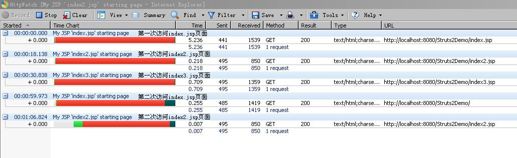 这是我用HttpWatch观测每个请求所用时间,第一次请求index.jsp,也就是 struts标签的form表单页面所用时间为5.236 第二个为请求 index2.jsp也就是普通form表单页面,用时0.218.