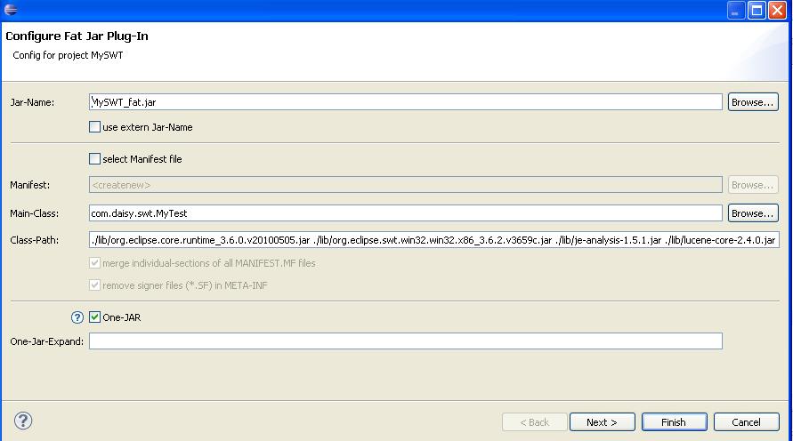 (3)Class-Path,要指定你使用的jar包的存放路径,如果是SWT使用的包,你需要添加 ./lib/org.eclipse.core.runtime_3.6.0.v20100505.jar ./lib/org.eclipse.swt.win32.win32.x86_3.6.2.v3659c.jar