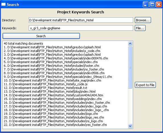 前两天公司一PM找我说他们那边QA在测试项目时,需要在项目中搜索一些关键词,而应用系统的搜索功能时,一方面搜索的时间会比较长(当项目很大时);另一方面竟发现有的时间会搜不到包含关键词的文件。所以让我能做一个简单的搜索应用:当选定项目位置时,给定适当的关键字,来搜索出项目中那些文件包含有这些关键字,把包含关键字的文档的信息显示出来,并可以导出到本地文件。当然,应用可视化界面。