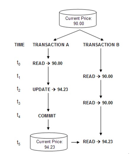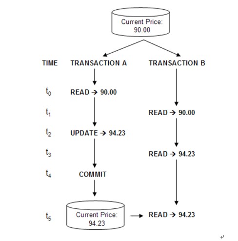 注意,当事务A在t2时刻更新了价格(94.23)之后,事务B在t3时刻仍然看不到该更新,此时读取价格仍然是90.00。这是一种是用较多的隔离级别,它既允许了事务B获取数据(支持并发性),同时又隐藏了其它事务(事务A)对该数据的更新,直到(事务A)提交的那一刻为止。几乎所有的数据库都支持“读已提交”的隔离级别,并且大部分将其作为缺省的隔离级别。