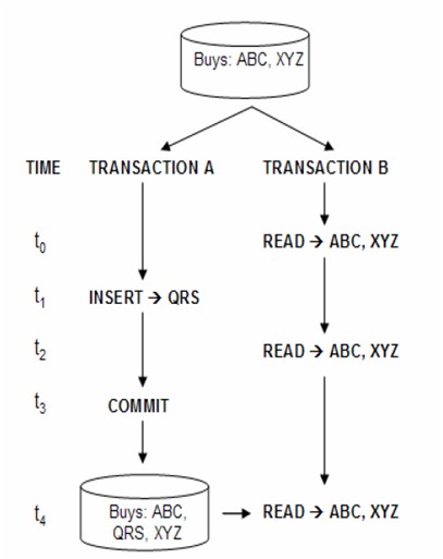 注意在这个例子中,尽管在事务B执行期间,事务A插入了一条数据(QRS),但是在事务B在t2时刻查询所得的结果依然和t0时刻一样(不包含QRS),即使到了t4时刻,事务A已经提交了也是如此(这一点不同于“读已提交”) 。只有在事务B也提交了,它才会看见事务A对数据库所作的修改。值得注意的是,该隔离级别下,会在被查询或修改的数据上加上读写锁,因此任何想要修改该数据的其它事务会等待(或失败),直到“可重复读”的事务提交为止。