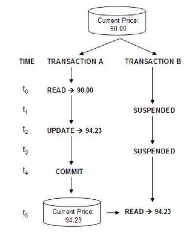 这一隔离级别允许多个事务同时操作一组数据,但是隐藏了事务之间所有未提交的更新;即事务A看不见事务B中对数据库所作的修改,直到事务B提交为止。仍然以上面的在线交易为例,此时的处理流程如下图所示: