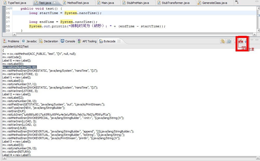 为了能够在加载前方便修改字节码,选择Asm,这需要jvm字节码结构和语法有一定了解。自己目前也不是很太熟悉,写出复杂的修改字节码的代码还是有一定难度,但幸运的是asm有一个eclipse插件,一段java代码,能够看到asm生成这段代码字节码的asm代码。在下面我要演示获取一段代码执行的时间,