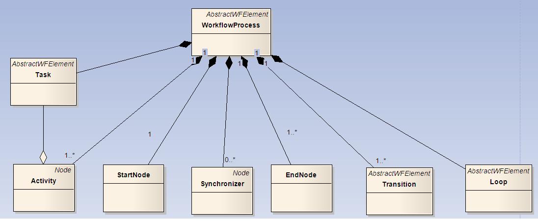 在工作流内部,按照元素的不同属性可以将元素分成两种类型。一种是映射到PetriNet的“工作流逻辑”元素,例如 Activity,StartNode, Synchronizer,EndNode,Transition;另一种是代“表业务逻辑”的元素,目前就是Task。WorkflowProcess是将二者组织在一起的最高层元素,既包含工作流逻辑元素,又包含业务逻辑元素。