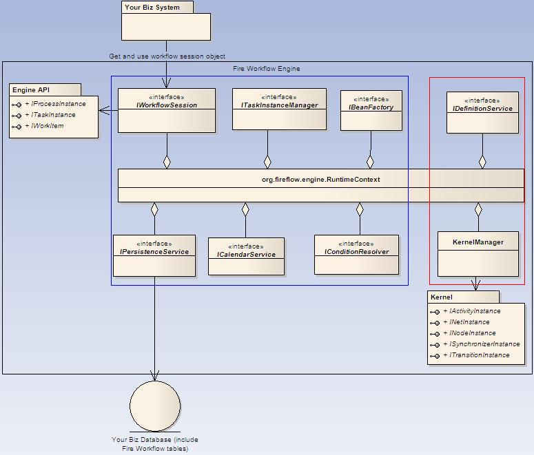 Fire workflow Engine由若干个服务组成,同理,这些服务也按照其职责的特性分成两类。一类服务完成业务相关的逻辑,另一类服务完成工作流流转逻辑。如下图3,红色部分属于工作流逻辑服务,蓝色部分属于业务逻辑服务。