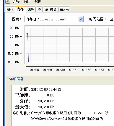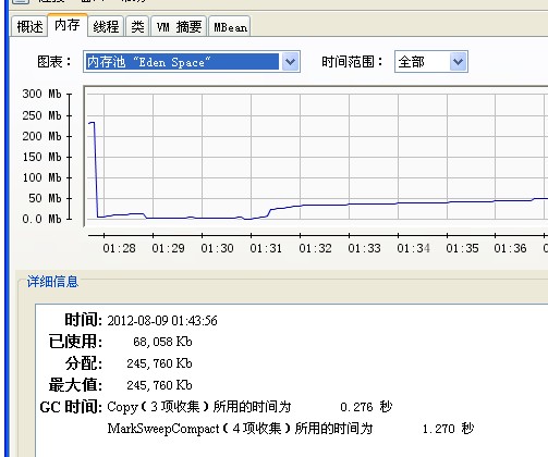 现再来分析gc原因,当DefNew(即为eden区,不知道为啥打印的日志名和jconsole上显示的名字不一样)内存达到245760K,正好为分配的240m,eden区内存已满开始回收,245760K->24701K,回收了245760K-24701K=215M,回收率还不错,还有25m左右没有回收。其中276480K经计算发现是eden+一个Survivor所占用内存,不知道何意?