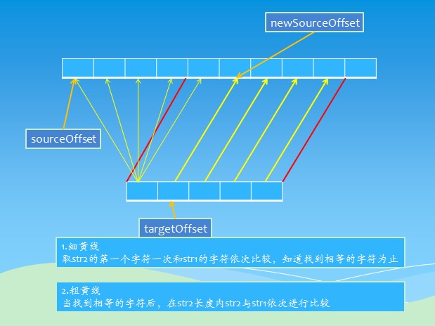 public static String compareDoubleString(String source, String target) {// 分别获取两个字符串的长度,因为后面会用到int sourceLength = source.length();int targetLength = target.length();// 获取目标的第一个字符char firstTargetChar = target.charAt(0);// 最多比较的次数int max = sourceLength - targetLength;// 如果第一个不相等,那么一直找到相等的那一个或者找完都不能找到int sourceOffset = -1;while (++sourceOffset < max&& source.charAt(sourceOffset) != firstTargetChar) {}if (sourceOffset <= max) {// 设置新的源索引int newSourceOffset = sourceOffset + 1;// 剩余的比较长度,也就是在offset上增加targetLengthint leaveLength = newSourceOffset + targetLength - 1;int targetOffset = 1;// 连续的比较,条件不符合的时候跳出for (; newSourceOffset < leaveLength&& source.charAt(newSourceOffset) == target.charAt(targetOffset); newSourceOffset++, targetOffset++);if (newSourceOffset == leaveLength) {return "包含:source包含target字符串!";}}return "不包含:source不包含target字符串!";}