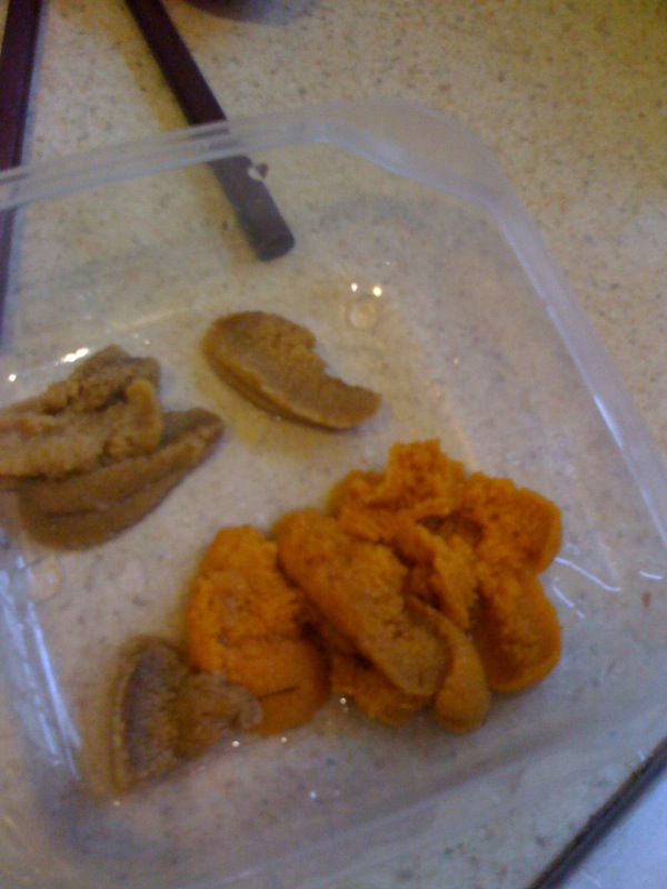 用剪刀剪开海胆嘴的部分, 剪出一片新天地 ^_^, 看见海胆黄了!