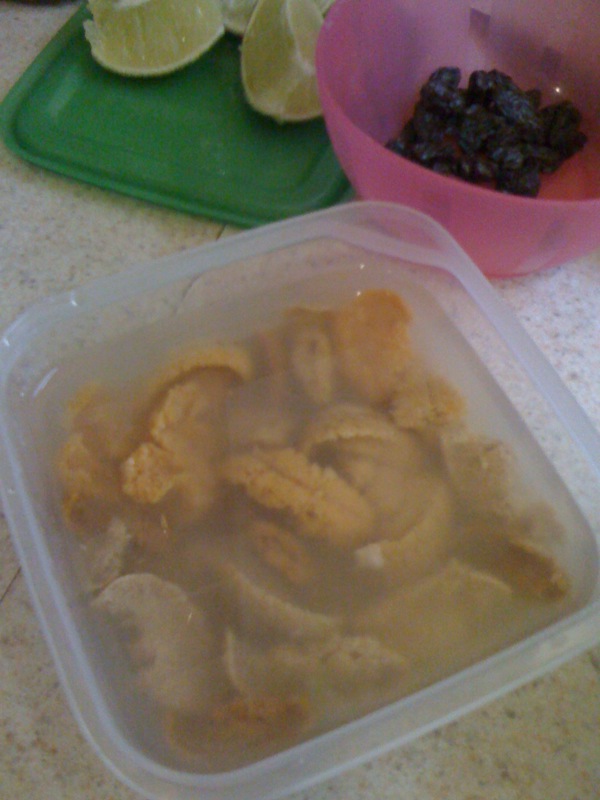 浸泡在盐和柠檬汁的凉开水里10分钟, 放冰箱里降温: