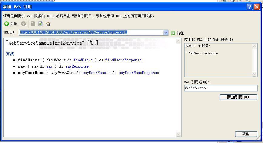 3.输入WebService地址:http://88.148.29.54:8080/aio/services/WebServiceSample?wsdl最后点击“添加引用”