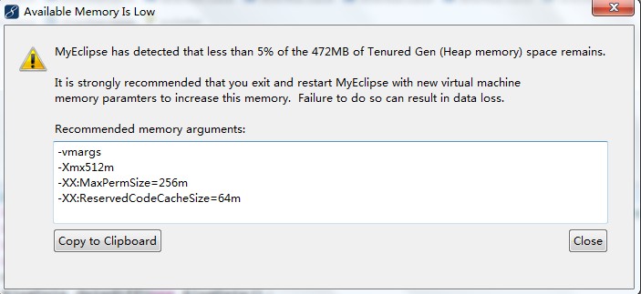 MyEclipse has detected that less than 5% of the 472MB of Tenured Gen (Heap memory) space remains.