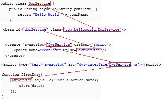 package com.helloworld;public class DwrService {public String sayHello(String yourName) {return "Hello World " + yourName;}}<?xml version="1.0" encoding="UTF-8"?><beans xmlns="http://www.springframework.org/schema/beans" xmlns:xsi="http://www.w3.org/2001/XMLSchema-instance" xsi:schemaLocation="http://www.springframework.org/schema/beans http://www.springframework.org/schema/beans/spring-beans-2.5.xsd"> <bean id="dwrService" name="code"><?xml version="1.0" encoding="UTF-8"?><!DOCTYPE dwr PUBLIC "-//GetAhead Limited//DTD Direct Web Remoting 2.0//EN" "http://www.getahead.ltd.uk/dwr/dwr20.dtd"> <dwr><allow><create javascript="DwrService" creator="spring"><param name="beanName" value="dwrService"/></create></allow></dwr>