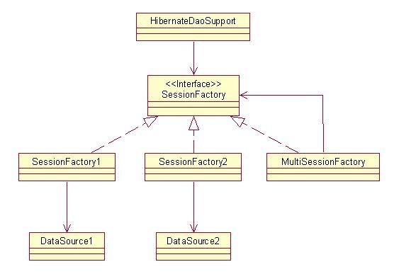 在该方案中,SessionFactory就是Hibernate的org.hibernate.SessionFactory接口,Decorator就是MultiSessionFactory,SessionFactory1和SessionFactory2往往是spring的org.springframework.orm.hibernate3.LocalSessionFactoryBean。细心的朋友可能会注意,实际上LocalSessionFactoryBean并不是SessionFactory的实现,这个方案是否有问题呢?这个问题其实也一直困扰了我好久,最后我发现,我们通过ApplicationContext的getBean()得到一个LocalSessionFactoryBean的时候其实并不是真正地得到了它,而是得到了一个SessionFactory,因为spring为LocalSessionFactoryBean重写了getObject(),使其返回的是SessionFactory。一个简单的明证就是,HibernateDaoSupport的sessionFactory属性的类型是SessionFactory,而我们在spring配置的时候注入的却是LocalSessionFactoryBean。