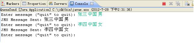 我们这个程序是测试发送对象的,其他的像发送textMessage啊,StreamMessage啊,较简单,就忽略了。