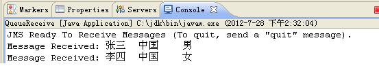 package com.test.jms;import java.io.Serializable;public class UserInfo implements Serializable { /** * */ private static final long serialVersionUID = 1L; private String name; private String address; private String gender; public String getAddress() { return address; } public void setAddress(String address) { this.address = address; } public String getName() { return name; } public void setName(String name) { this.name = name; }public String getGender() {return gender;}public void setGender(String gender) {this.gender = gender;}}package com.test.jms;import java.io.BufferedReader; import java.io.IOException; import java.io.InputStreamReader; import java.util.Hashtable; import javax.jms.BytesMessage; import javax.jms.JMSException; import javax.jms.MapMessage; import javax.jms.ObjectMessage; import javax.jms.Queue; import javax.jms.QueueConnection; import javax.jms.QueueConnectionFactory; import javax.jms.QueueSender; import javax.jms.QueueSession; import javax.jms.Session; import javax.jms.StreamMessage; import javax.jms.TextMessage; import javax.naming.Context; import javax.naming.InitialContext; import javax.naming.NamingException; public class QueueSend { // Defines the JNDI context factory. public final static String JNDI_FACTORY = "weblogic.jndi.WLInitialContextFactory"; // Defines the JNDI provider url. public final static String PROVIDER_URL = "t3://localhost:7001"; //这里要同你的本地配置 // Defines the JMS connection factory for the queue. public final static String JMS_FACTORY = "javax.jms.QueueConnectionFactory"; // Defines the queue 用的是对应 QUEUE的JNDI名子 public final static String QUEUE = "testqueue"; //这里也要同你上面设置的Queue JNDI一致 private QueueConnectionFactory qconFactory; private QueueConnection qcon; private QueueSession qsession; private QueueSender qsender; private Queue queue; private TextMessage msg; private StreamMessage sm; private BytesMessage bm; private MapMessage mm; private ObjectMessage om; /** * Creates all the necessary objects for sending messages to a JMS queue. * * @param ctx * JNDI initial context * @param queueName * name of queue * @exception NamingException * if operation cannot be performed * @exception JMSException * if JMS fails to initialize due to internal error */ public void init(Context ctx, String queueName) throws NamingException, JMSException { qconFactory = (QueueConnectionFactory) ctx.lookup(JMS_FACTORY); qcon = qconFactory.createQueueConnection(); qsession = qcon.createQueueSession(false, Session.AUTO_ACKNOWLEDGE); queue = (Queue) ctx.lookup(queueName); qsender = qsession.createSender(queue); /* msg = qsession.createTextMessage(); sm = qsession.createStreamMessage(); bm = qsession.createBytesMessage(); mm = qsession.createMapMessage(); */ om = qsession.createObjectMessage(); qcon.start(); } /** * Sends a message to a JMS queue. * * @param message * message to be sent * @exception JMSException * if JMS fails to send message due to internal error */ public void send(String message) throws JMSException { // set TextMessage //msg.setText(message); // set BytesMessage String input = message; String name = input.split(" ")[0]; String address = input.split(" ")[1]; String gender = input.split(" ")[2]; // set ObjectMessage UserInfo ui = new UserInfo(); ui.setName(name); ui.setAddress(address); ui.setGender(gender); om.setObject(ui); qsender.send(om); } /** * Closes JMS objects. * * @exception JMSException * if JMS fails to close objects due to internal error */ public void close() throws JMSException { qsender.close(); qsession.close(); qcon.close(); } public static void main(String[] args) throws Exception { InitialContext ic = getInitialContext(); QueueSend qs = new QueueSend(); qs.init(ic, QUEUE); readAndSend(qs); qs.close(); } private static void readAndSend(QueueSend qs) throws IOException, JMSException { BufferedReader msgStream = new BufferedReader(new InputStreamReader( System.in)); String line = null; boolean quitNow = false; do { System.out.print("Enter message ("quit" to quit): "); line = msgStream.readLine(); if (line != null && line.trim().length() != 0) { qs.send(line); System.out.println("JMS Message Sent: " + line + "\t"); quitNow = line.equalsIgnoreCase("quit"); } } while (!quitNow); } private static InitialContext getInitialContext() throws NamingException { Hashtable env = new Hashtable(); env.put(Context.INITIAL_CONTEXT_FACTORY, JNDI_FACTORY); env.put(Context.PROVIDER_URL, PROVIDER_URL); return new InitialContext(env); } } package com.test.jms;import java.util.Hashtable; import javax.jms.BytesMessage; import javax.jms.JMSException; import javax.jms.MapMessage; import javax.jms.Message; import javax.jms.MessageListener; import javax.jms.ObjectMessage; import javax.jms.Queue; import javax.jms.QueueConnection; import javax.jms.QueueConnectionFactory; import javax.jms.QueueReceiver; import javax.jms.QueueSession; import javax.jms.Session; import javax.jms.StreamMessage; import javax.jms.TextMessage; import javax.naming.Context; import javax.naming.InitialContext; import javax.naming.NamingException; public class QueueReceive implements MessageListener { // Defines the JNDI context factory. public final static String JNDI_FACTORY = "weblogic.jndi.WLInitialContextFactory"; // Defines the JNDI provider url. public final static String PROVIDER_URL = "t3://localhost:7001"; // Defines the JMS connection factory for the queue. public final static String JMS_FACTORY = "javax.jms.QueueConnectionFactory"; // Defines the queue 用的是对应 QUEUE的JNDI名子 public final static String QUEUE = "testqueue"; private QueueConnectionFactory qconFactory; private QueueConnection qcon; private QueueSession qsession; private QueueReceiver qreceiver; private Queue queue; private boolean quit = false; /** * Message listener interface. * * @param msg * message */ public void onMessage(Message msg) { try { String msgText = ""; String name; String address; String gender; if (msg instanceof TextMessage) { msgTex