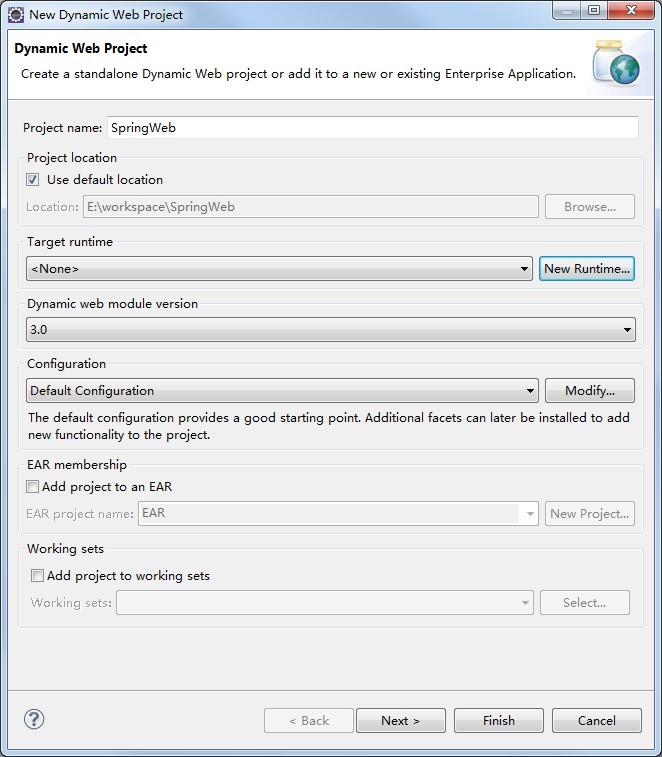 二、填入项目名称project name,我这里是SpringWeb;然后点击New Runtime来创建一个Server: