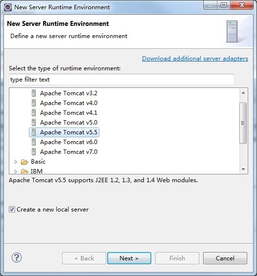 三、选择你的tomcat对应的版本,我这里是Apache Tomcat v5.5。然后选择Create a new local server: