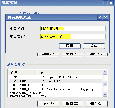 a)在系统变量里面点新建,变量名为PLAY_HOME,变量值为E:\play-1.0\(对应你的play!解压的位置)