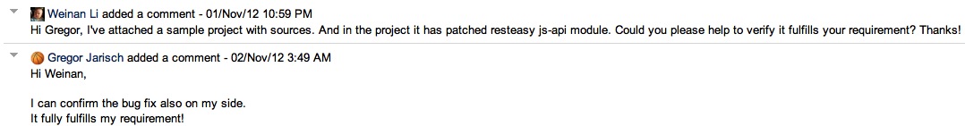 但是社区一般开发资源非常有限,不可能对每一个用户的问题都能及时跟进和解决。特别是像RESTEasy这样有很大用户群的项目,用户的反馈特别多,而主要的开发人员只有Bill, Ron和我三个人。