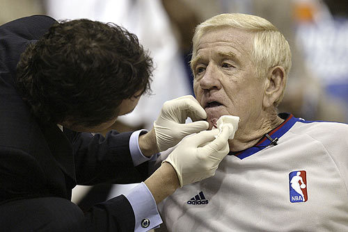 裁判还被球打坏了下巴,并且之后又被场外观众绊倒了,真是狼狈,他自己也觉得非常不爽,嘴巴鼓足了气,呵呵。这老头好像是大牌,叫做Jess Kersey,30th as nba official.