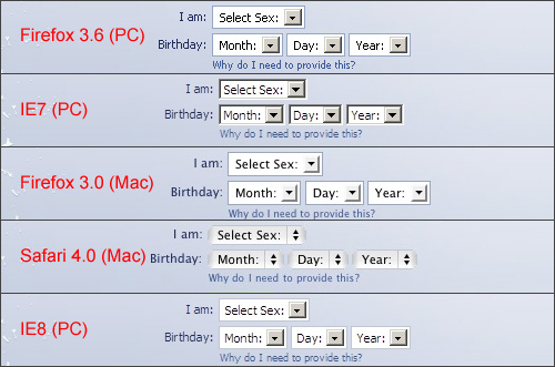以下是 Facebook 首页中的 select 控件,在5种不同浏览器的显示差异(基于 Adobe’s Browserlab 截图)