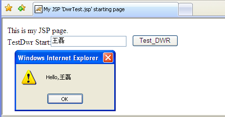 package com.wl.dwr.test;public class FirstDwrTest {public String sayHello(String name){return "Hello,"+name;}}<%@ page language="java" import="java.util.*" pageEncoding="UTF-8"%><%String path = request.getContextPath();String basePath = request.getScheme()+"://"+request.getServerName()+":"+request.getServerPort()+path+"/";%><!DOCTYPE HTML PUBLIC "-//W3C//DTD HTML 4.01 Transitional//EN"><html> <head> <base href="<%=basePath%>"> <title>My JSP 'DwrTest.jsp' starting page</title> <meta http-equiv="pragma" content="no-cache"><meta http-equiv="cache-control" content="no-cache"><meta http-equiv="expires" content="0"> <meta http-equiv="keywords" content="keyword1,keyword2,keyword3"><meta http-equiv="description" content="This is my page"><!--<link rel="stylesheet" type="text/css" href="styles.css">--><script type="text/javascript" src="dwr/engine.js"></script> <script type="text/javascript" src="dwr/util.js"></script> <script type="text/javascript" src="dwr/interface/DwrTest.js"></script> <script type="text/javascript"> function Say(){ var inputName=document.getElementById("name").value; DwrTest.sayHello(inputName,function(data){alert(data);}); }</script> </head> <body> This is my JSP page. <br> TestDwr Start:<input type="text" id="name" value=""/> <input type="button" onclick="Say()" value="Test_DWR"/> </body></html>