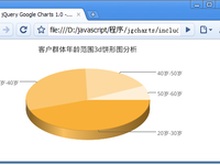 <!DOCTYPE html PUBLIC "-//W3C//DTD XHTML 1.0 Strict//EN" "http://www.w3.org/TR/xhtml1/DTD/xhtml1-strict.dtd"><html xmlns="http://www.w3.org/1999/xhtml" xml:lang="en" lang="en"><head> <meta http-equiv="Content-type" content="text/html; charset=UTF-8" /> <script src="../../lib/jquery/jquery-1.3.2.min.js" type="text/javascript"></script><script src="../../jgcharts.pack.js" type="text/javascript"></script><script>var api = new jGCharts.Api();jQuery('<img>').attr('src', api.make({axis_labels : ['20岁-30岁','30岁-40岁','40岁-50岁','50岁-60岁'],data : [[7400], [5000], [3000], [1200]],colors : ['f8b038'],type : 'p3',//default bvgsize : '400x200',title : '客户群体年龄范围数据分析'})).appendTo("#bar1");});</script></head> <body><div id="bar1"></div></body></html>