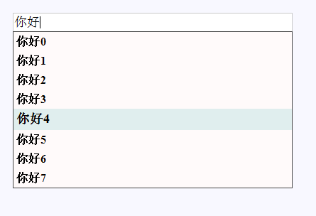 body {    background-color: #F8F8FF;}#main {    position: absolute;    top: 100px;    left: 36%;    width: 400px;    background-color: #F5FFFA;}#input_text {    position: absolute;    font-size: 18px;    width: 390px;    height: 23px;    border: 1px solid #C9C9C9;}#input_div {    position: absolute;    width: 392px;    top: 26px;    border: 1px solid #454545;    display: none;    overflow: hidden;}#input_div {    text-decoration: none;    background-color: #FFFAFA;}#input_div div {    vertical-align: middle;    padding: 4px;    font-weight: bold;    color: #000000;    width: 100%;}.div_item_select {    background-color: #E0EEEE;    height: 22px;    font-size: 18px;}