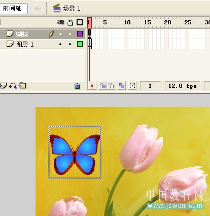 新建一个图层2,改名为“蝴蝶”,这一层就是要放蝴蝶影片的层。在第一帧导入一张蝴蝶的图片,或是自己画一只蝴蝶。