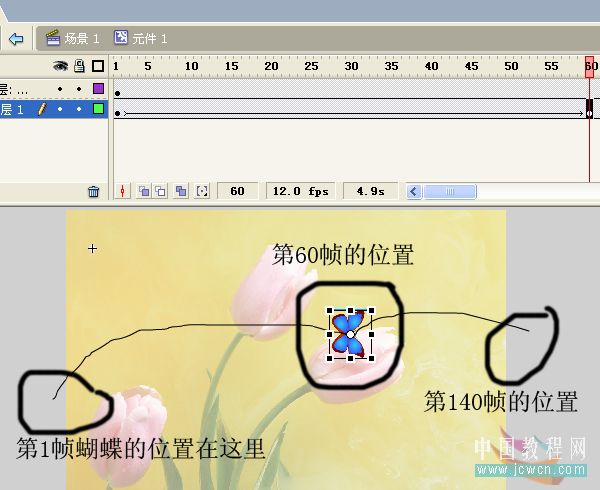 这蝴蝶感觉太大了,先缩小下先,调整好蝴蝶的大小后,先添加引导层,然后画好引导线,画好后在引导层第140帧插入帧。再点击下图层1第1帧,把蝴蝶放在引导线的起始位置,然后在60帧插入关键帧,调整好蝴蝶的位置,再分别在100帧和140帧插入关键帧,然后在140帧调整好蝴蝶的位置,最后分别在第1帧和第100帧右击创建补间动画。(这里主要是说方法,所以过程我就不详说了,不明白的可以翻下别的教程?^_^)