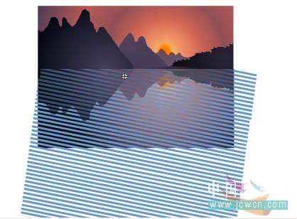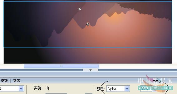 把山垂直翻转,用变形工具适当的把山的高度压扁,再用方向键向下移动,在属性面板里设置Alpha为55%左右。