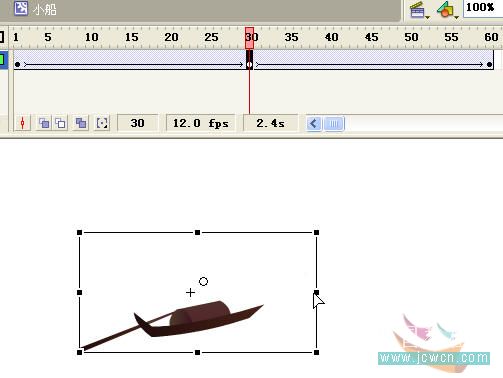 从库中把小船拖入,第30、60帧分别插入关键帧,在第30帧用变形工具选中小船,左右方向把小船压稍微窄,创建动画补间。
