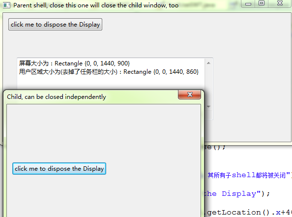 import org.eclipse.swt.widgets.Display;import org.eclipse.swt.widgets.Shell;import org.eclipse.swt.widgets.Button;import org.eclipse.swt.SWT;import org.eclipse.swt.events.SelectionAdapter;import org.eclipse.swt.events.SelectionEvent;import org.eclipse.swt.widgets.Text;/** * 测试父组件被释放,子组件或子窗口也将被释放 * display为shell的父组件 * shell可以为其他shell的父组件 * 测试打印屏幕尺寸的方法 * */public class testShellTree {private Text text;/** * Launch the application. * @param args */public static void main(String[] args) {try {testShellTree window = new testShellTree();window.open();} catch (Exception e) {e.printStackTrace();}}/** * Open the window. */public void open() {Display display = Display.getDefault();//父窗口Shell shellParent = new Shell();shellParent.setSize(602, 300);shellParent.setText("Parent shell, close this one will close the child window, too");//释放display的按钮Button btn = new Button(shellParent, SWT.NONE);btn.addSelectionListener(new SelectionAdapter() {@Overridepublic void widgetSelected(SelectionEvent e) {Display.getDefault().dispose();}});btn.setBounds(10, 10, 193, 27);btn.setToolTipText("关闭display对象后,其所有子shell都将被关闭");btn.setText("click me to dispose the Display");//显示屏幕信息的文本框text = new Text(shellParent, SWT.BORDER | SWT.H_SCROLL | SWT.V_SCROLL | SWT.CANCEL | SWT.MULTI);text.setBounds(28, 91, 400, 127);String monitorInfo=Display.getDefault().getPrimaryMonitor().getBounds().toString();String clientAreaInfo=Display.getDefault().getPrimaryMonitor().getClientArea().toString();text.setText("屏幕大小为:"+monitorInfo+"\n用户区域大小为(去掉了任务栏的大小):"+clientAreaInfo);//子窗口Shell shellChild=new Shell(shellParent);shellChild.setText("Child, can be closed independently");shellChild.setSize(400, 300);Button btn2 = new Button(shellChild, SWT.NONE);btn2.addSelectionListener(new SelectionAdapter() {@Overridepublic void widgetSelected(SelectionEvent e) {Display.getDefault().dispose();}});btn2.setToolTipText("关闭display对象后,其所有子shell都将被关闭");btn2.setBounds(10, 117, 193, 27);btn2.setText("click me to dispose the Display");shellChild.setLocation(shellParent.getLocation().x+400, shellParent.getLocation().y+200);shellParent.open();shellChild.open();shellParent.layout();//事件循环while (!shellParent.isDisposed()||!shellChild.isDisposed()) {if (!display.readAndDispatch()) {display.sleep();}}}}
