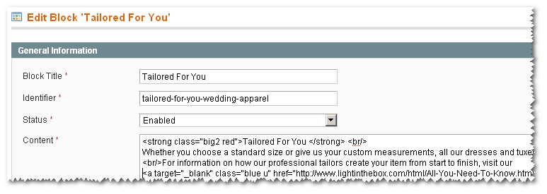 该问题在Magento有非常完美的解决方案,那就是Static Block。在后台CMS->Static Block,增加一条记录,identifier字段名为:tailored-for-you-wedding-apparel