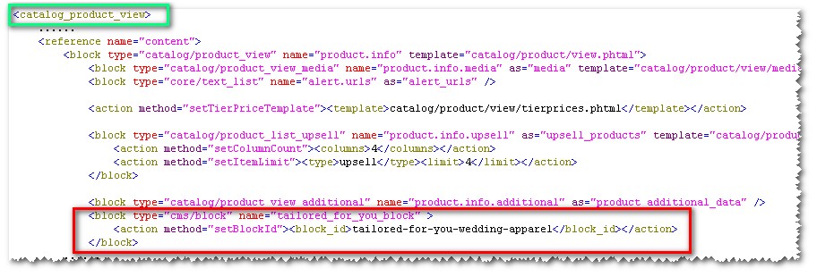 <block type="cms/block" name="tailored_for_you_block" > <action method="setBlockId"><block_id>tailored-for-you-wedding-apparel</block_id></action></block>