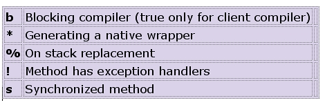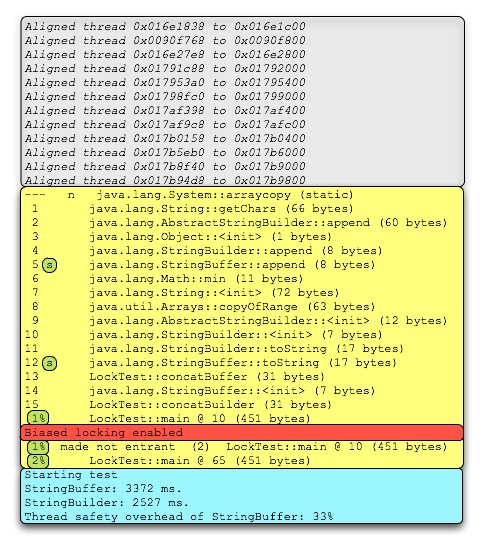 图1 基准测试的执行栈输出JVM默认会启动12个线程,包括:主线程、对象引用处理器、Finalize、Attach监听器等等。上图中第一个灰色段显示的是这些线程的对齐,它们可以使用偏向锁(注意所有地址都以00结尾)。你尽管忽略可以忽略它们。接下来的黄色段包含了已编译方法的信息。我们看一下第5行和12行,能够发现它们都标记了一个额外的“s”。表1的信息告诉我们这些方法都是同步的。包含了“%”的各行已经使用了OSR。红色的行是偏向锁被激活的地方。最底下的蓝绿色框是基准测试开始计时的地方。从记录基准测试开始时间的输出中可以看到,所有编译都已经发生了。这说明前期的预热阶段足够长了。如果你想了解日志输出规范的更多细节,可以参考这个页面http://forum.java.sun.com/thread.jspa?forumID=27&messageID=980887&threadID=235212和这篇文章http://www.unixville.com/~moazam/stories/2004/06/17/thePrintcompilationFlagAndHowToReadItsOutput.html。