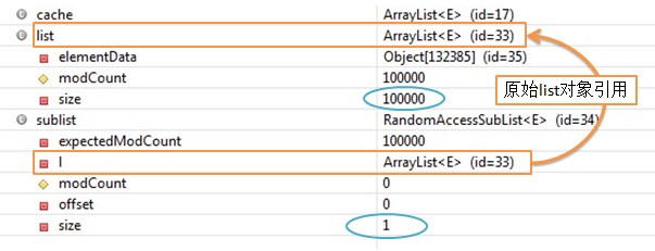 但是SubList的这种方式,会有一个极大的隐患:这个SubList的实例中,保存有原有list对象的引用——而且是强引用,这意味着, 只要sublist没有被jvm回收,那么这个原有list对象就不能gc,这个list中保存的所有对象也不能gc,即使这个list和其包含的对象已经没有其他任何引用。