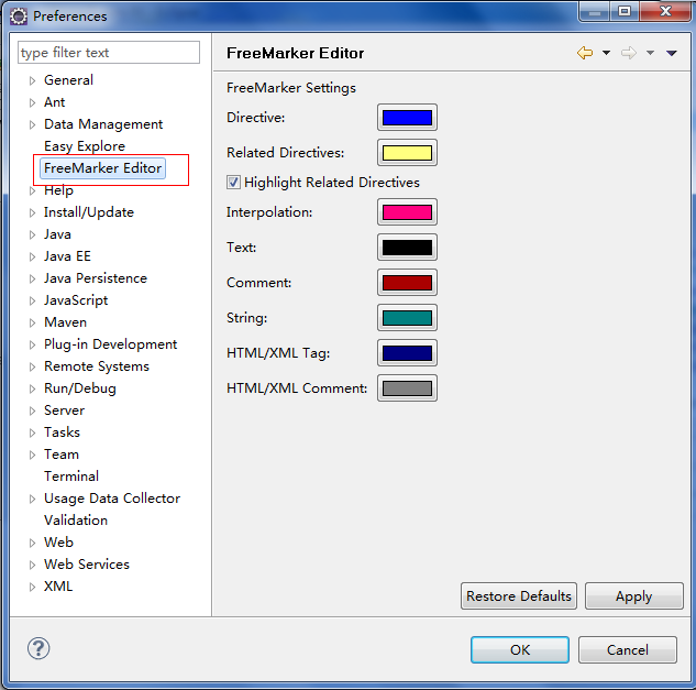 3. 退出Eclipse再重启,在window --> Preferences 左边的树形栏里出现FreeMarker Editor一项新的内容