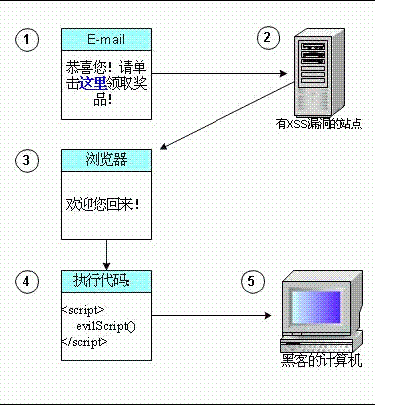 一个黑客发现A证券公司公司的Web 站点存在一个跨站点脚本攻击缺陷,所以他决定要利用这点来收集你所持股票的名称等敏感信息。黑客会您你发送一封电子邮件,声称您中奖了,并且需要点击某个链接如“点击这里”来领取奖品。注意,该链接将超链接到www.azhengquan.com/default.asp?name=< script >evilScript()< / script > 当您点击这个链接,映入眼帘您的将是“欢迎您回来!”—— 等等,您的姓名哪里去了?事实上,单击电子邮件内的链接之后,你实际上就是在通知A证券公司公司的Web 站点,你的姓名是< script > evilScript()< /script >。Web服务器把用这个“名字”生成的HTML返回给你,但是你的浏览器会把这个“名字”作为脚本代码解释,脚本执行后便出现了我们前面看到的一幕。一般情况下,支持客户端脚本是浏览器的典型功能之一。如果这个脚本命令浏览器向黑客的计算机发回一个cookie,即使这个cookie包含有您的股票的有关信息,您的浏览器也会老老实实地执行。最后,那些来自A证券公司的Web 站点的指令获取了那个包含敏感信息的cookie。