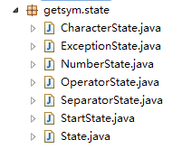 /** * 2012 2012-10-29 下午9:01:54 * Compiler getsym.state */package getsym.state;import getsym.Controler;/** * @author zhenzxie.iteye.com * @version 1.0 * @since 1.0 */public class CharacterState extends State {@Override public void handle(char c, Controler controler) {if (isCharacter(c)||(isNumber(c)&&isCurrentWordNotEmpty())) {this.append2CurrentWord(c);} else {this.dealCurrentWord();this.clearCurrentWord();State targetState = null;if (isOperator(c)) {targetState = Controler.operatState;} else if (isSeperator(c)) {targetState = Controler.separatorState;}targetState.handle(c, controler);controler.changeState(targetState);}}private void dealCurrentWord() {String word = this.getCurrentWord();if (isKeyWord(word))this.addAKeyWord(word);// 关键字elsethis.addAId(word);// 标识符}}/** * 2012 2012-10-29 上午11:16:57 * Compiler getsym */package getsym;import getsym.state.CharacterState;import getsym.state.NumberState;import getsym.state.OperatorState;import getsym.state.SeparatorState;import getsym.state.StartState;import getsym.state.State;/** * @author zhenzxie.iteye.com * @version 1.0 * @since 1.0 */public class Controler {public static State startState = new StartState();public static State characterState = new CharacterState();public static State numberState = new NumberState();public static State operatState = new OperatorState();public static State separatorState = new SeparatorState();public void deal(char c){currentState.handle(c, this);}public void changeState(State state) {Controler.currentState = state;}private static State currentState = startState;}