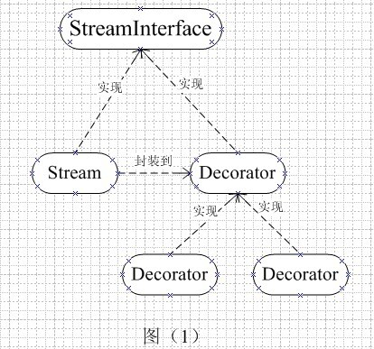 在图(1)中,decorator和stream都继承了StreamInterface这个接口,decorator是一个装饰类,他封装了Stream这个类,拥有StreamInterface的所有功能,这样在不缺失原有功能的情况下,可以添加更多的功能。