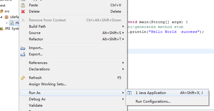 7.如图3.9,运行该java文件,在HelloWrold.java 上点击右键,移动鼠标到[Java Application]上,点击左键: