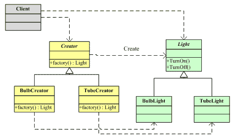 具体工厂(Concrete Creator)角色:这是实现抽象工厂接口的具体工厂类,包含与应用程序密切相关的逻辑,并且受到应用程序调用以创建产品对象。在上图中有两个这样的角色:BulbCreator与TubeCreator。