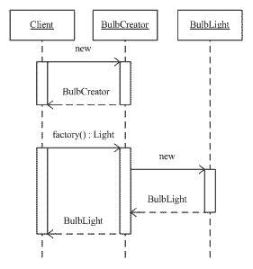 客户端创建BulbCreator对象,客户端持有此对象的类型是Creator,而实际类型是BulbCreator。然后客户端调用 BulbCreator的factory方法,之后BulbCreator调用BulbLight的构造函数创造出产品BulbLight对象。